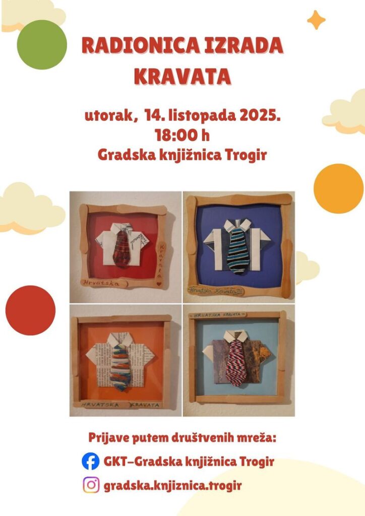 Povodom Dana kravate, hrvatskog simbola elegancije i kulturne baštine, Gradska knjižnica Trogir organizira posebnu radionicu izrade kravate od starih knjiga, namijenjenu djeci. Ovaj kreativni i edukativni susret održat će se u utorak, 14. listopada, od 18 do 19 sati u prostorijama knjižnice.