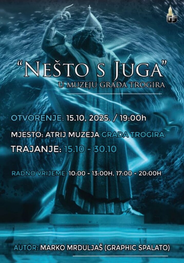 U Muzeju grada Trogira 15. listopada 2025. u 19:00 sati bit će otvorena izložba “Nešto s juga” mladog vizualnog autora i grafičkog dizajnera Marka Mrduljaša, osnivača kreativnog identiteta Graphic Spalato. U svom radu Mrduljaš (Split, 2003.) istražuje i interpretira autentični duh juga i Mediterana kroz suvremeni dizajn, digitalnu umjetnost i snažan vizualni storytelling.