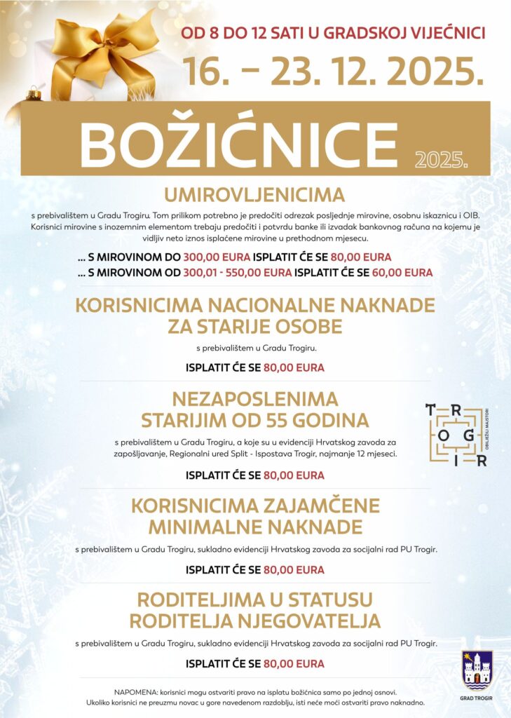 Grad Trogir objavio je Javni poziv za dodjelu božićnica namijenjenih najranjivijim skupinama građana. Podjela će se provoditi od 16. do 23. prosinca 2025. godine, svakim radnim danom od 8 do 12 sati u Gradskoj vijećnici.