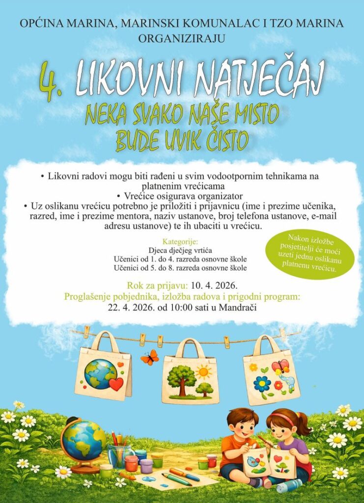 Općina Marina, Marinski komunalac i Turistička zajednica Općine Marina organiziraju 4. likovni natječaj pod nazivom “Neka svako naše misto bude uvik čisto”, s ciljem poticanja djece i mladih na razmišljanje o važnosti očuvanja okoliša i čistoće mjesta u kojem žive.