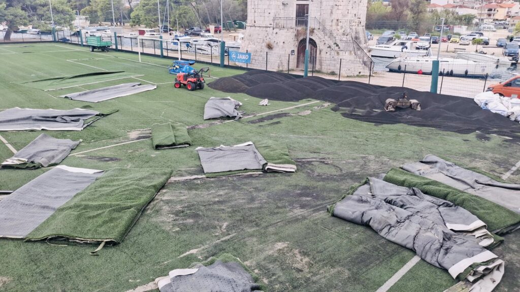 - Proveli smo javni natječaj u posljednja dva mjeseca, a početkom lipnja izabran je izvođač. Prošli tjedan krenula je demontaža starog travnjaka. Prvo se moralo skinuti skoro 200 tona gumenih granula koje se nalaze u podlozi, a potom se mogla rezati i ukloniti stara trava, pojašnjava.